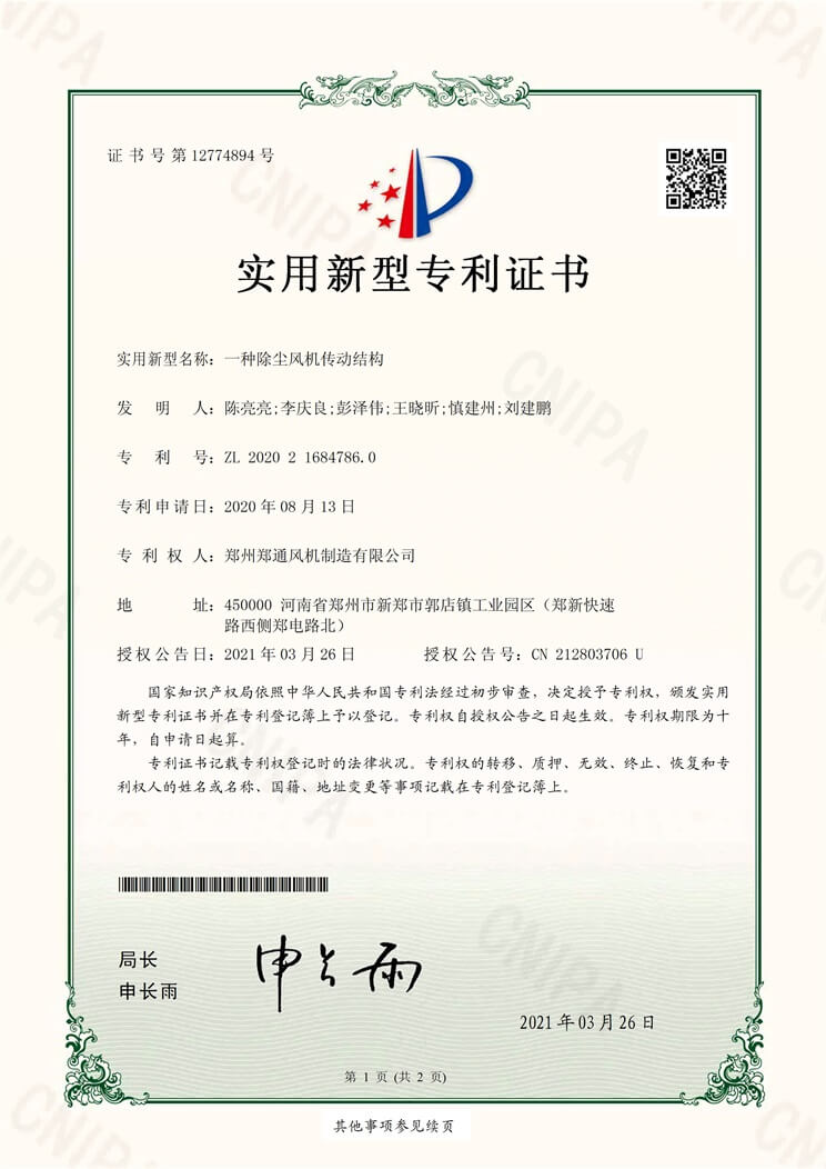 一種除塵風(fēng)機(jī)傳動(dòng)結(jié)構(gòu)實(shí)用新型專利證書